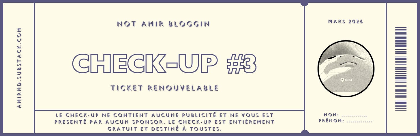 Bienvenue sur le Check-Up, l’endroit où on se demande si mes yeux sont aussi rouges à cause d’une réaction allergique ou si ce sont les news que je lis incessamment sur mes écrans qui me font cet effet.